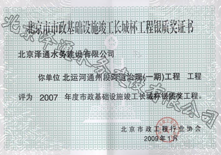 2007年度北京市市政基礎設施竣工長城杯工程銀質獎證書