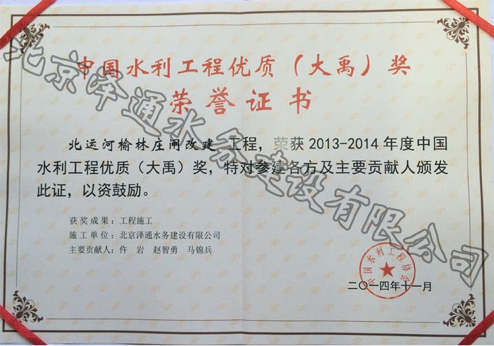 2013-2014年度中國水利工程優(yōu)質(大禹)獎榮譽證書